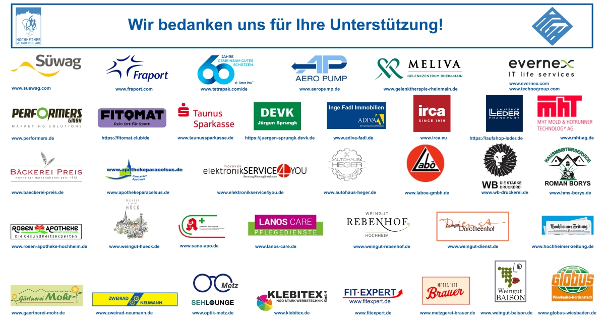 Das Organisationsteam bedankt sich sehr herzlich bei allen, die zum Gelingen des 21. Hochheimer Weinbergslauf beigetragen haben: bei allen Helferinnen und Helfern, bei der Stadt Hochheim am Main, dem Kleintierzuchtverein, der Freiwilligen Feuerwehr Hochheim, DRK, und natürlich bei allen unseren Sponsoren. Und insbesondere bei Kolleg*innen von cologne timing GmbH, die uns heute und auch die ganze lange Zeit in der Vorbereitungsphase unterstützt haben.